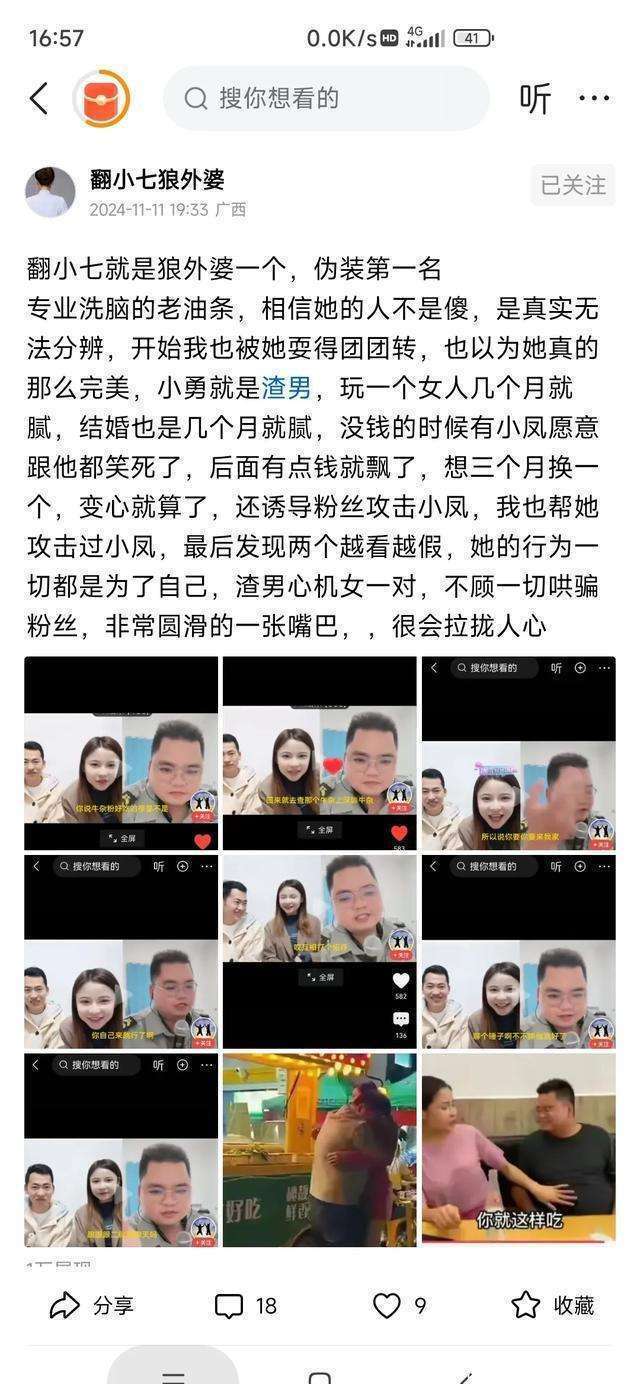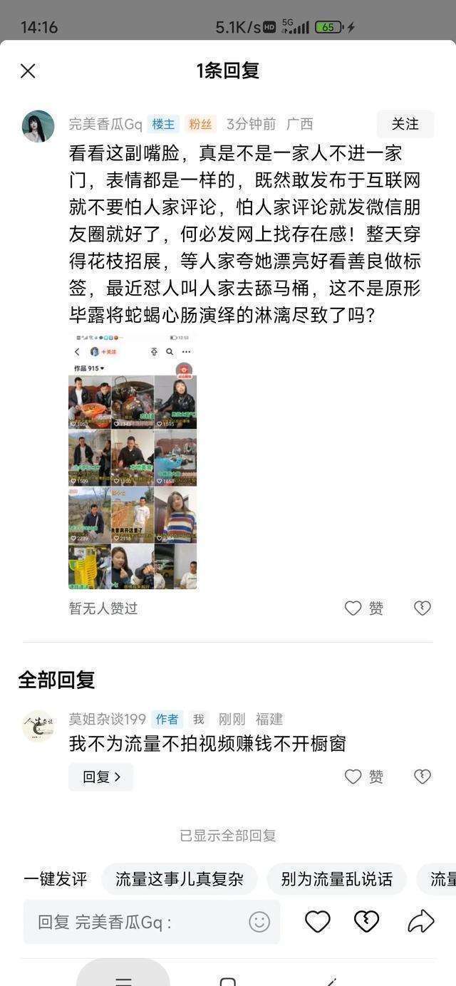 这时候,很多粉丝开始点评潘小七夫妻不真诚。哼,这让我也不禁想起小凤,我觉得小凤在这方面就比潘小七要真诚得多。然而,事情并没有就此平息。潘小七怀疑是莫姐的小号在搞鬼,于是开启了一场充满硝烟的“嘴仗”。这就像是一场看不见硝烟的战争,双方都试图用自己的言辞来击垮对方。