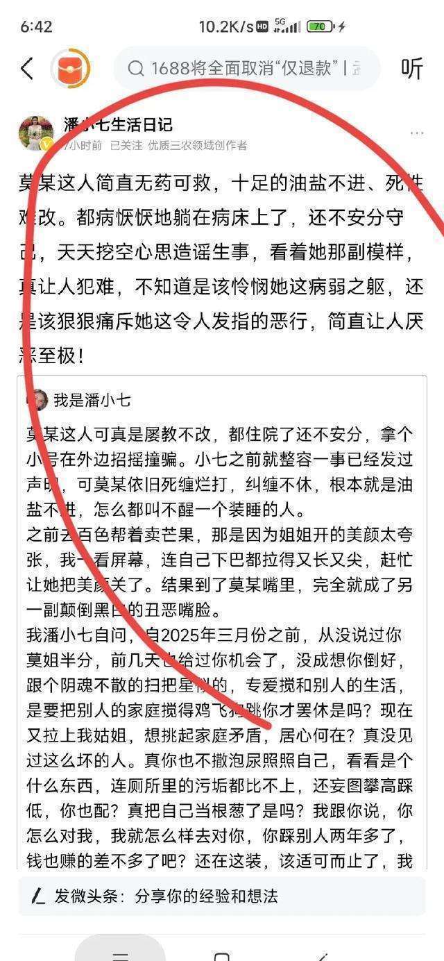 我真的觉得潘小七在这个事情上做得太过分了。她的那些文章,真的是文化水平低下的体现。她把写文章当成了一场可以肆意撒野的闹剧,完全不顾及自己的形象。她总是用自己的主观臆断去评判别人,这怎么能行呢?她以为这样就能打压莫姐,自己就能占上风,其实她大错特错了。在这个网红众多的时代,只有真诚才能赢得人心,而不是靠这种下三滥的手段。